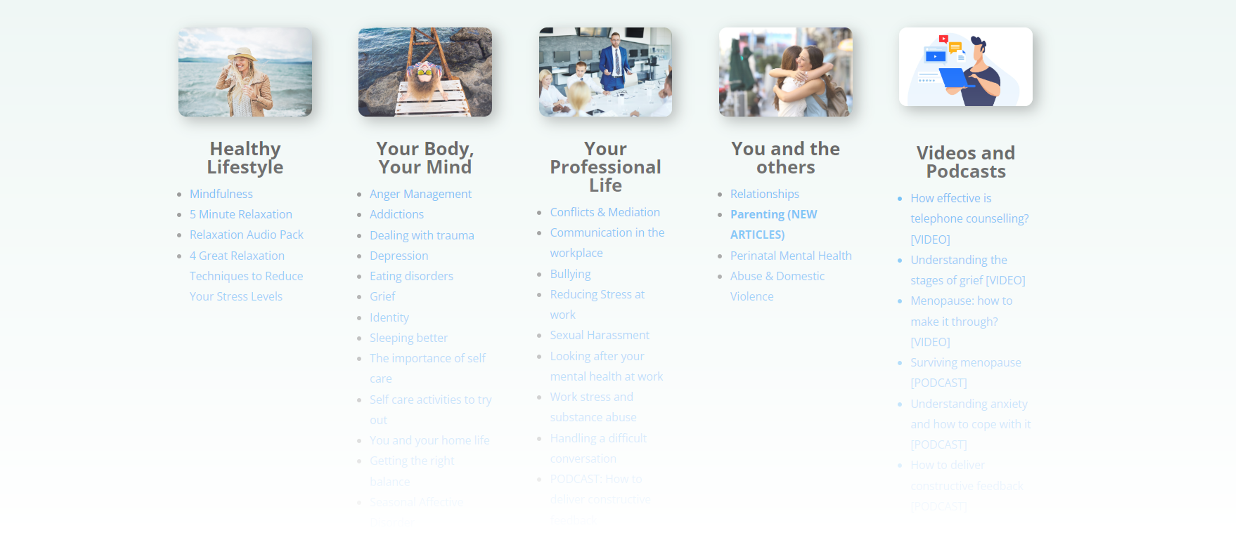Visit your Online wellbeing space and access self-help tools such as videos, podcasts, articles and guides about personal and professional matters.